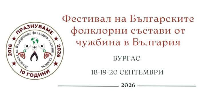 Фестивал на българските фолклорни състави от чужбина ще се състои в Бургас в периода 18-20 септември 2026 година. Това съобщиха на своята страница във Фейсбук и в своя сайт от Асоциацията на българските фолклорни състави в чужбина (АБФСЧ).