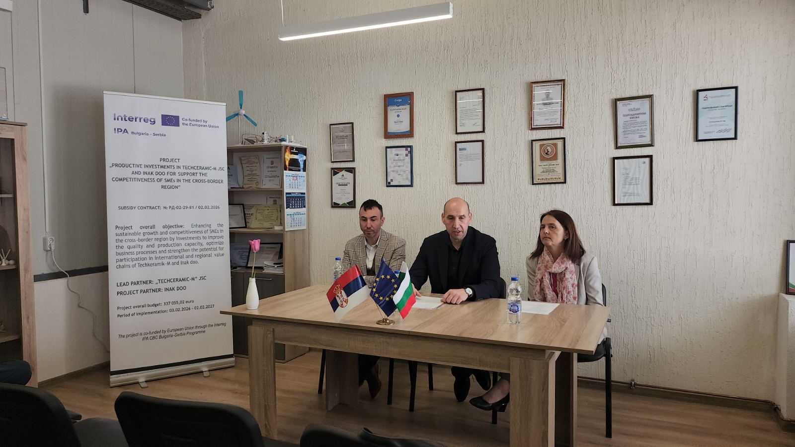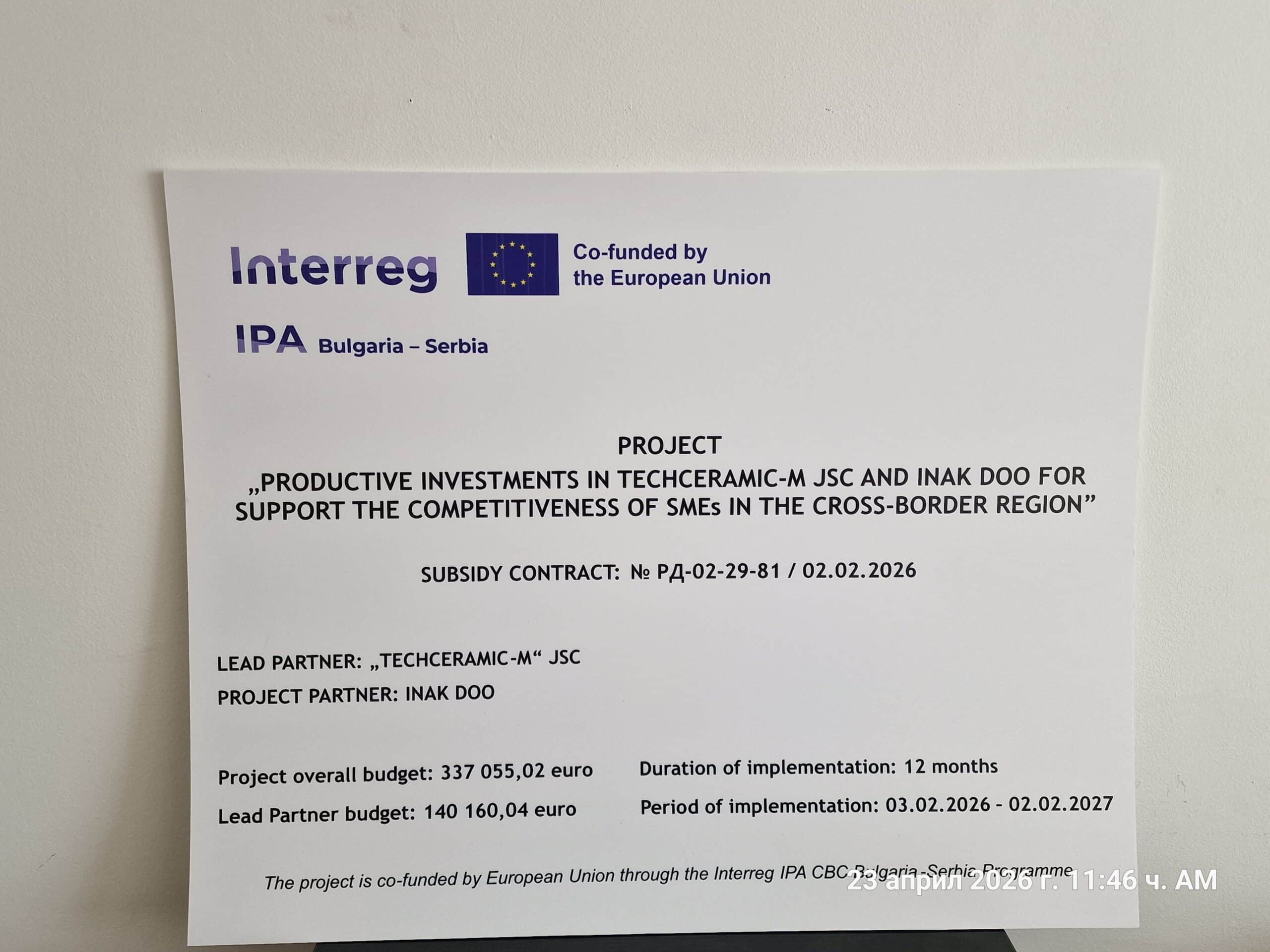 На 23 Април 2026 г. в град Мездра, България се проведе начална пресконференция за представяне на съвместен проект „Продуктови инвестиции в „Техкерамик-М“ АД и „Инак“ Доо за подкрепа на конкурентоспособността на МСП в трансграничния регион“, CBComepetRegion, финансиран от Програма за трансгранично сътрудничество Interreg VI-A ИПП България–Сърбия 2021-2027.